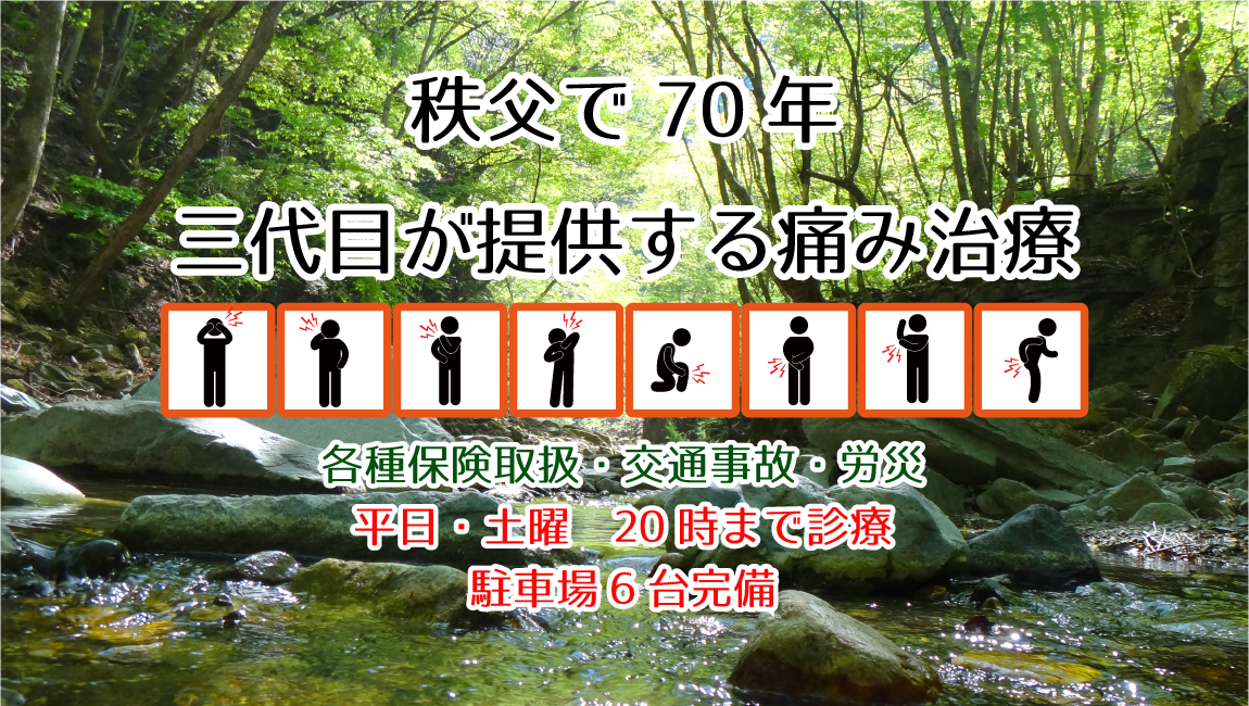 秩父で一番古い接骨院のひとつ。代々伝わる明石流手技療法と最新の治療機器を用いて、患者様のお身体の不調を改善します。